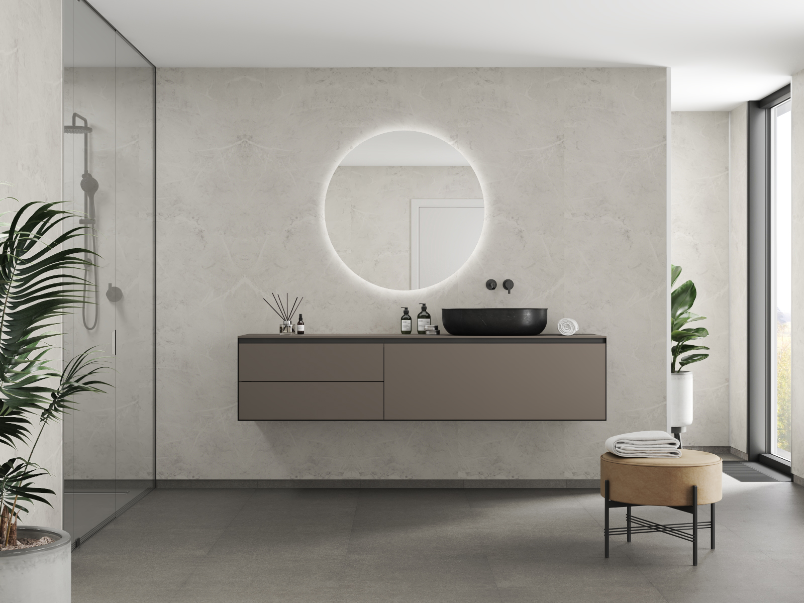 Ajaton marmorikuvioitu seinäpaneeli, jossa vaaleat sävyt ja hienovarainen kuviointi luovat raikkaan ja harmonisen ilmeen.